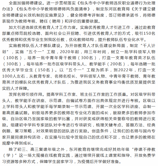關(guān)注教師招聘考試的小伙伴們要注意了,目前在包頭教育在線(xiàn)微信公眾號(hào)上發(fā)布了2020年?yáng)|河區(qū)教育工作規(guī)劃,并且在計(jì)劃中提到了要加大引進(jìn)選拔優(yōu)秀教育人才工作力度,實(shí)施優(yōu)秀教育人才引進(jìn)工作,通過(guò)赴教育部重點(diǎn)師范院校選聘、面向社會(huì)公開(kāi)招聘、引進(jìn)優(yōu)秀教育人才的方式,吸引150名優(yōu)秀教師和優(yōu)秀畢業(yè)生到我區(qū)任教,優(yōu)化教師結(jié)構(gòu),提升教師隊(duì)伍專(zhuān)業(yè)化水平。