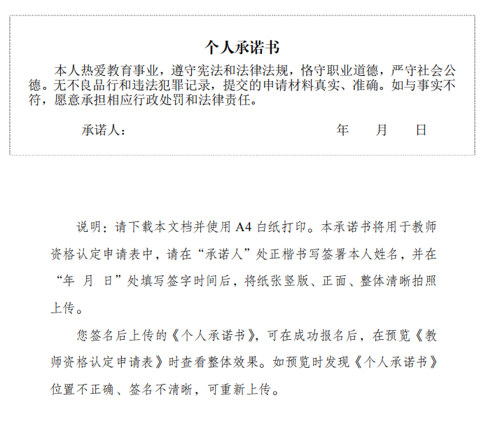 說(shuō)明:請(qǐng)下載本文檔并使用 A4 白紙打印。本承諾書(shū)將用于教師資格認(rèn)定申請(qǐng)表中,請(qǐng)?jiān)?ldquo;承諾人”處正楷書(shū)寫(xiě)簽署本人姓名,并在“年 月 日”處填寫(xiě)簽字時(shí)間后,將紙張豎版、正面、整體清晰拍照上傳(在上傳個(gè)人承諾書(shū)時(shí),只需截圖個(gè)人承諾書(shū)部分即可。)。您簽名后上傳的《個(gè)人承諾書(shū)》,可在成功報(bào)名后,在預(yù)覽《教師格認(rèn)定申請(qǐng)表》時(shí)查看整體效果。如預(yù)覽時(shí)發(fā)現(xiàn)《個(gè)人承諾書(shū)》位置不正確、簽名不清晰,可重新上傳。