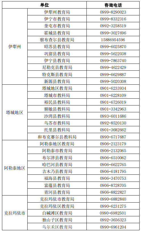 新疆各地教師資格認(rèn)定機(jī)構(gòu)咨詢(xún)電話: