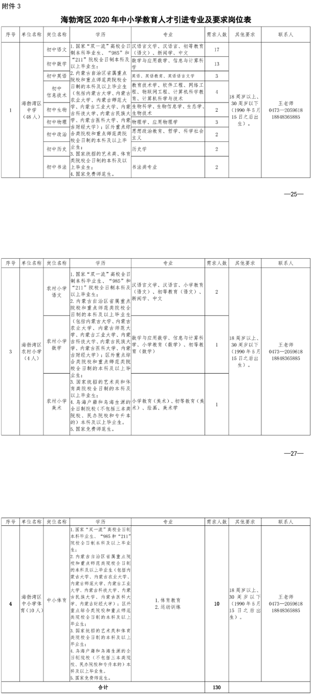 2020烏海海勃灣區(qū)中小學教育人才引進130名職位表