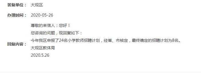 近日,有網(wǎng)友向安慶大觀區(qū)教體局咨詢今年小學招聘計劃,安慶大觀區(qū)教體局回復:今年我區(qū)申報了24名小學教師招聘計劃,經(jīng)省、市核定,最終確定的計劃為8名。