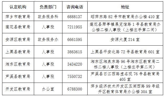 附表:萍鄉(xiāng)市各教師資格認(rèn)定機(jī)構(gòu)聯(lián)系方式