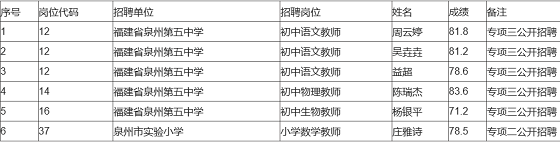 根據(jù)《2021年泉州市直公立學校專項公開招聘新任教師公告(二)》《2021年泉州市直公立學校專項公開招聘新任教師公告(三)》,現(xiàn)將擬聘用人員及成績公示如下,公示時間:2021年11月1日--2021年11月9日。若有疑問,請咨詢0595-22781630。