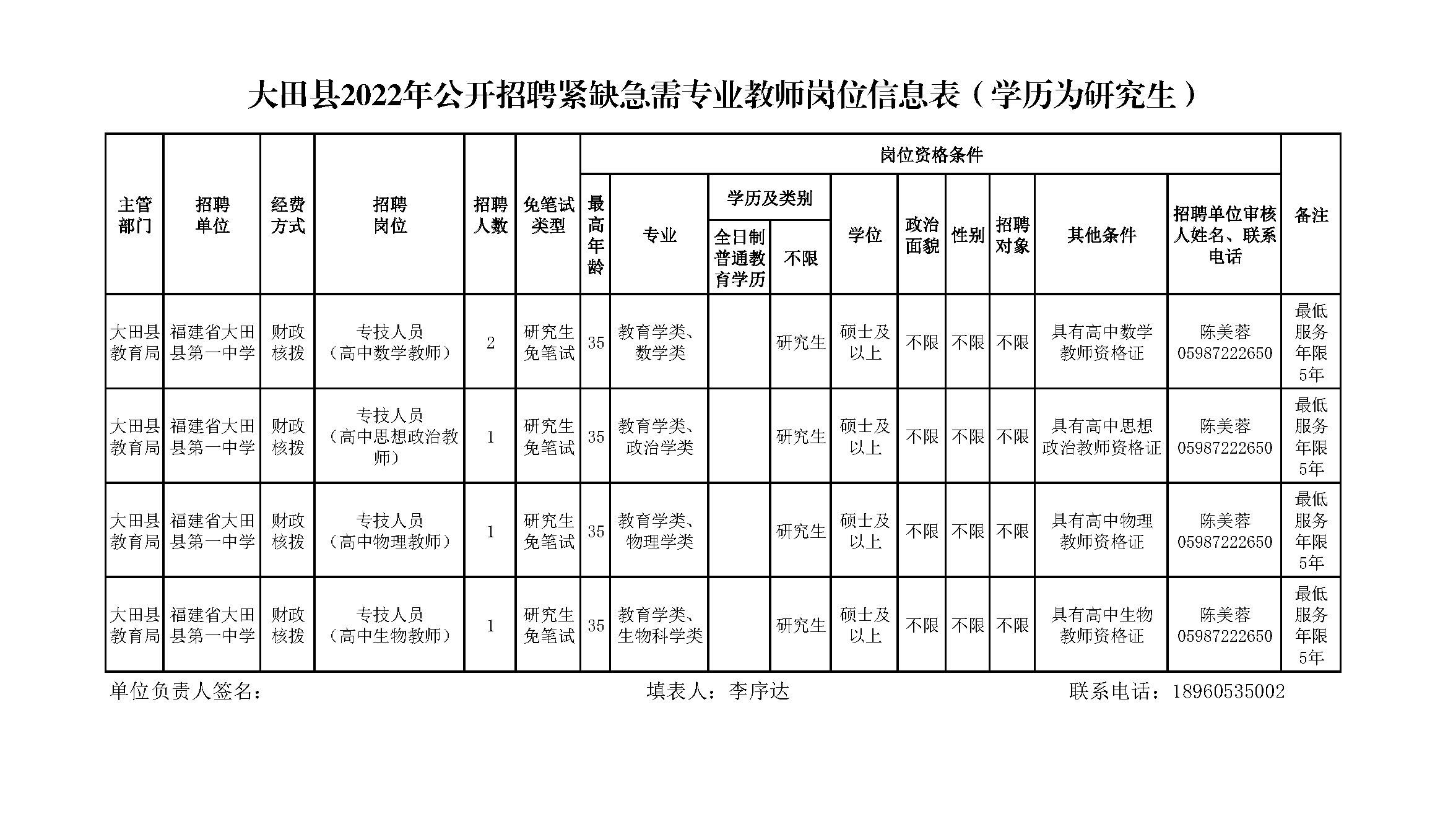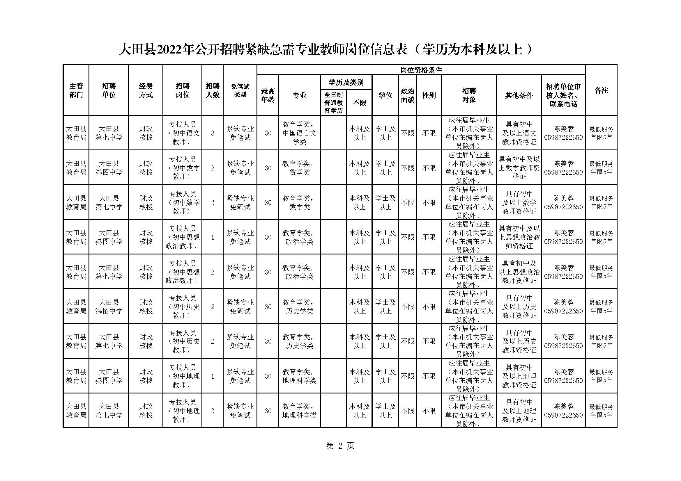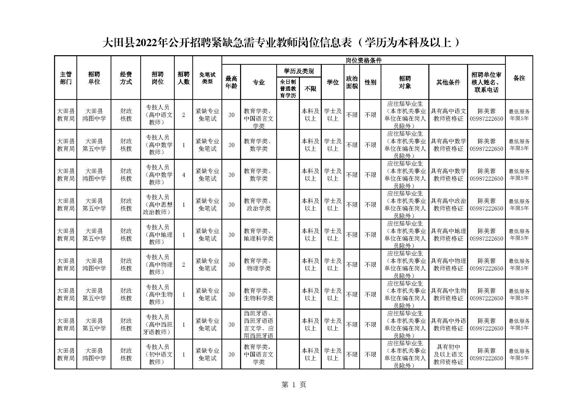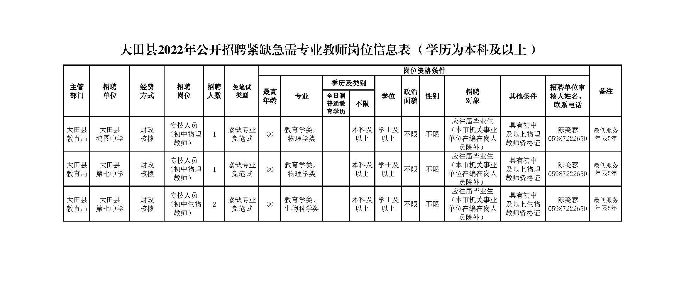 經(jīng)研究,決定于2021年11月20日上午9:00-12:00在三明學(xué)院藝術(shù)樓招聘緊缺急需專業(yè)教師,招聘條件、辦法與程序具體見大田縣人民政府網(wǎng)站(“教育信息-通知公告”)2021年10月13日發(fā)布的《大田縣2022年緊缺急需專業(yè)教師公開招聘方案》。招聘崗位如下: