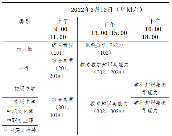 (一)內(nèi)蒙古自治區(qū)2022年上半年全國(guó)中小學(xué)教師資格考試(筆試)日期為2022年3月12日,具體時(shí)間如下: