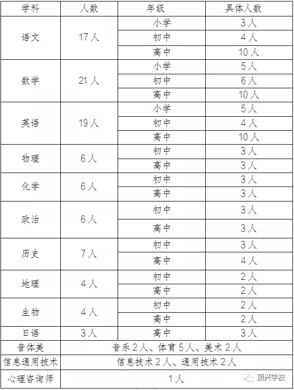 為了實現(xiàn)《頂興學校八年發(fā)展計劃》,頂興學校特向社會誠聘一批具有崇高的理想、遠大的目標,敢思、敢想、敢拼、敢闖;堅定理想信念,勇于擔當作為,執(zhí)著于教書育人,有熱愛教育的定力,淡薄名利的堅守,能夠吃苦耐勞,敢于攻堅克難;借助頂興的平臺實現(xiàn)自己人生價值、體現(xiàn)自己的人生意義的教師。