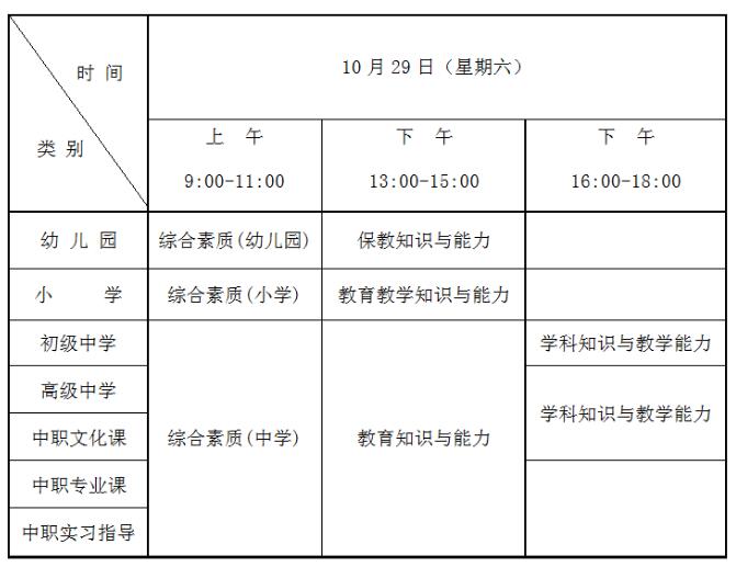 (一)中小學(xué)教師資格考試(筆試)日期為2022年10月29日,具體時間安排如下: