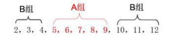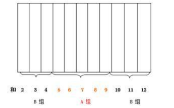 教師:雖然擲出的兩個(gè)骰子的點(diǎn)數(shù)之和可能是 2,3,4,…,12 中的任意一個(gè)數(shù),但這些和出現(xiàn)的可能性大小是不同的。下面老師把可能出現(xiàn)的這 11 個(gè)和分成 A、B 兩組,如下圖所示: