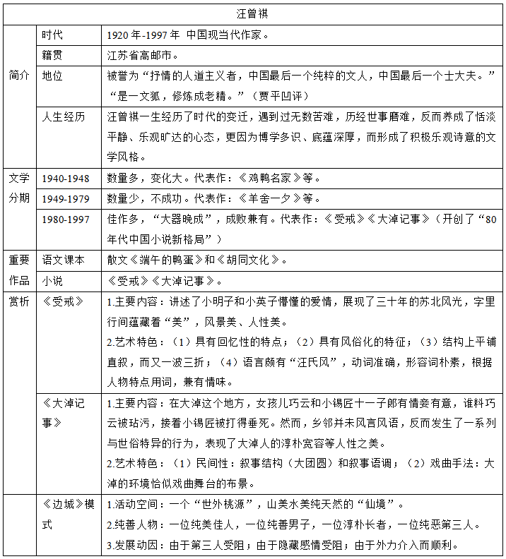 汪曾祺先生博學(xué)多才,經(jīng)歷豐富,歷經(jīng)坎坷,卻心態(tài)平和。作品頗多,令人稱贊。經(jīng)過總結(jié)分析之后,??贾R(shí)點(diǎn):