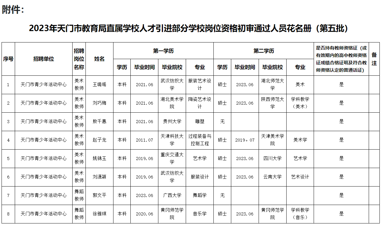 附件:2023年天門市教育局直屬學(xué)校人才引進(jìn)部分學(xué)校崗位資格初審?fù)ㄟ^人員花名冊(第五批)