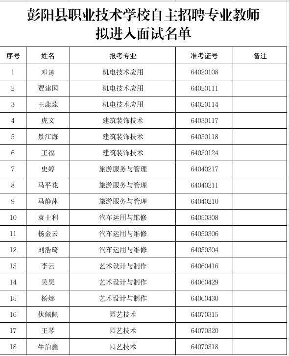 現(xiàn)將彭陽縣職業(yè)技術(shù)學校自主招聘專業(yè)教師擬進入面試人員名單公示如下,公示日期:2023年8月30日至2023年9月1日,聯(lián)系電話:0954-7012876。