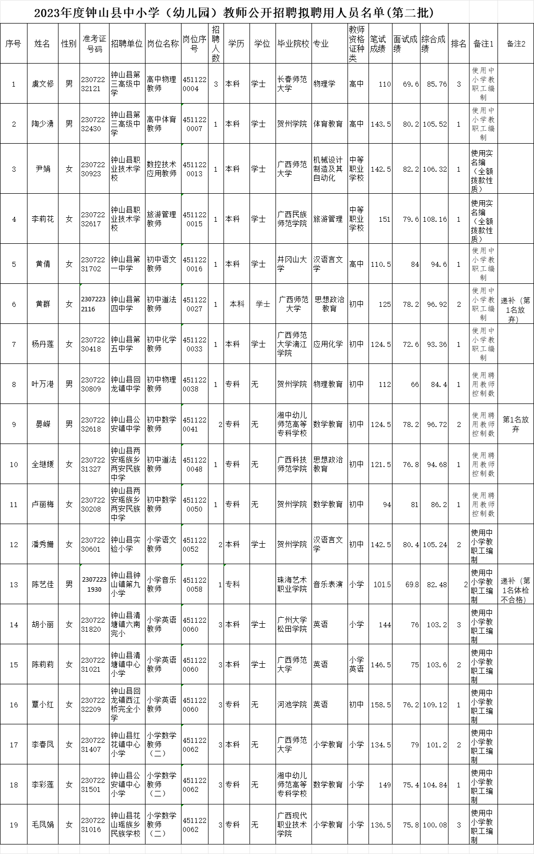 附件:2023年度鐘山縣中小學(幼兒園)教師公開招聘擬聘人員名單(第二批)