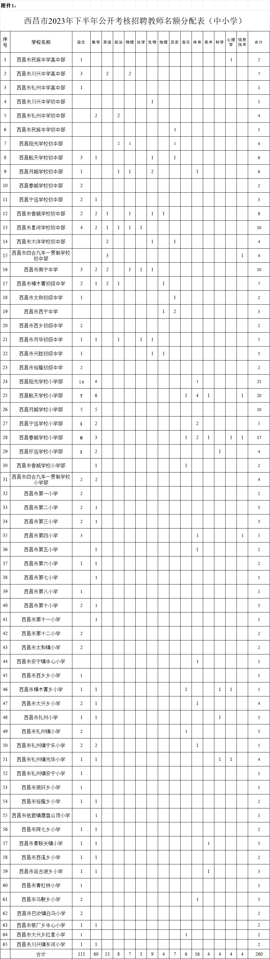 1.西昌市2023年下半年公開考核招聘教師名額分配表(中小學) |