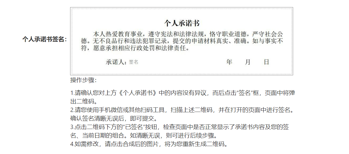 特別提示:申請(qǐng)人需提前下載安裝學(xué)信網(wǎng)APP,在報(bào)名時(shí)掃碼授權(quán),并在報(bào)名認(rèn)定系統(tǒng)上點(diǎn)擊“已完成”按鈕,完成學(xué)歷學(xué)籍信息核驗(yàn),具體的申報(bào)操作步驟,申請(qǐng)人查閱《教師資格認(rèn)定申請(qǐng)人使用手冊(cè)》(附件1)。