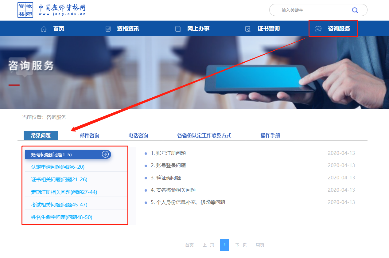 在教師資格認(rèn)定過(guò)程中遇到問(wèn)題,請(qǐng)先參考中國(guó)教師資格網(wǎng)導(dǎo)航欄中的咨詢(xún)服務(wù)—常見(jiàn)問(wèn)題對(duì)照處理。