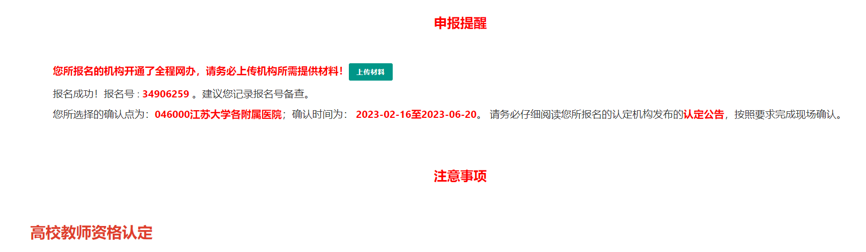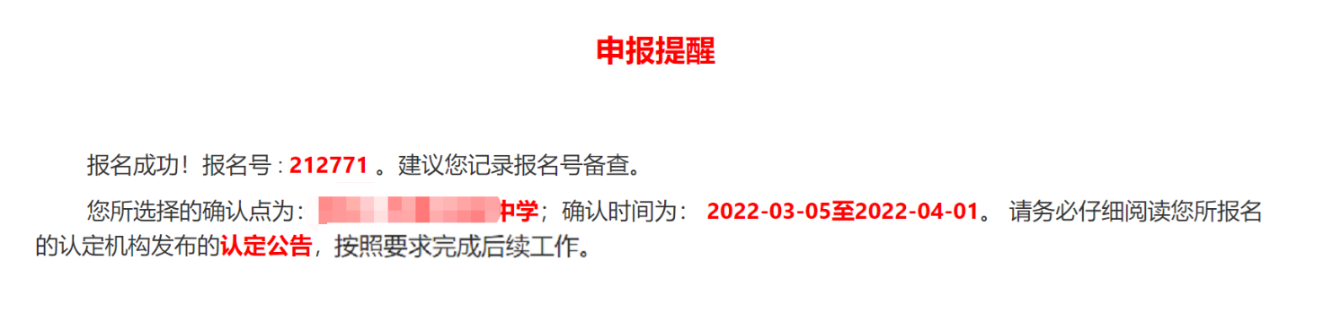 2.網(wǎng)上申報(bào):在認(rèn)定機(jī)構(gòu)規(guī)定的網(wǎng)上報(bào)名時(shí)間內(nèi),申請(qǐng)人登錄“中國(guó)教師資格網(wǎng)”進(jìn)行報(bào)名,在報(bào)名前,請(qǐng)認(rèn)真閱讀相關(guān)須知和注意事項(xiàng),如實(shí)、準(zhǔn)確填寫(xiě)申報(bào)信息,并按要求上傳相應(yīng)的材料和電子證件照片(格式JPG,背景為彩色白底),完成網(wǎng)上申報(bào)的所有環(huán)節(jié),出現(xiàn)“申報(bào)提醒”頁(yè)面并生成報(bào)名號(hào),即表示報(bào)名成功。