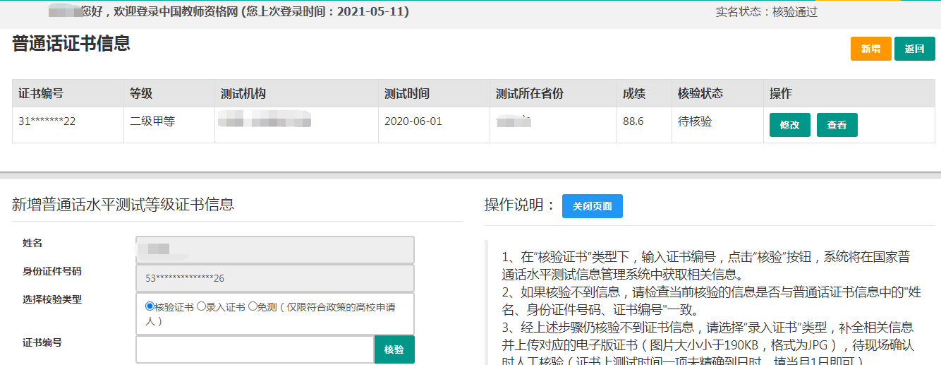 ②錄入證書(shū):僅限2007年之前的普通話(huà)證書(shū)或無(wú)法核驗(yàn)通過(guò)的證書(shū)。補(bǔ)全相關(guān)信息(普通話(huà)信息分?jǐn)?shù)欄必須填寫(xiě)數(shù)字)后,需攜帶證書(shū)原件至現(xiàn)場(chǎng)確認(rèn)時(shí)人工核驗(yàn)。核驗(yàn)狀態(tài)指系統(tǒng)核驗(yàn)狀態(tài),人工核驗(yàn)通過(guò)不會(huì)更改核驗(yàn)狀態(tài)。