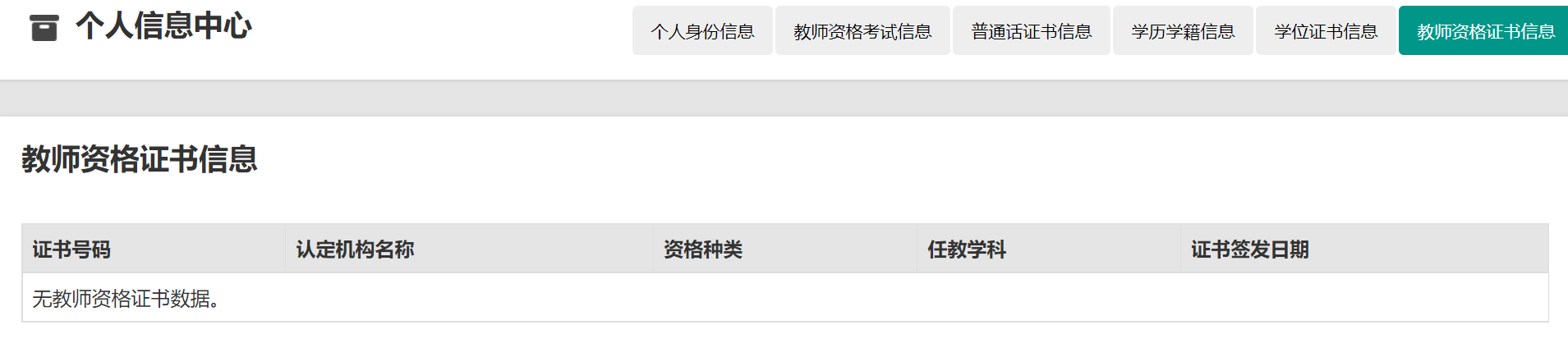個(gè)人信息中心共有七個(gè)模塊:個(gè)人身份信息、教師資格考試信息、普通話(huà)證書(shū)信息、學(xué)歷學(xué)籍信息、學(xué)位證書(shū)信息、教師資格證書(shū)信息、其他證書(shū)信息。