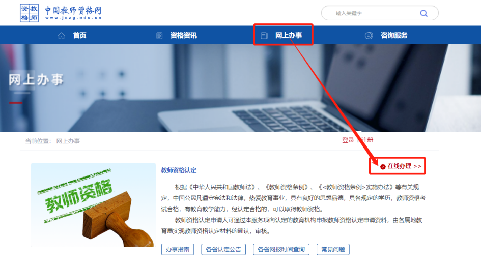 教師資格認(rèn)定申請(qǐng)人進(jìn)入申報(bào)系統(tǒng)的入口為【網(wǎng)上辦事】—【教師資格認(rèn)定】—【在線辦理】。