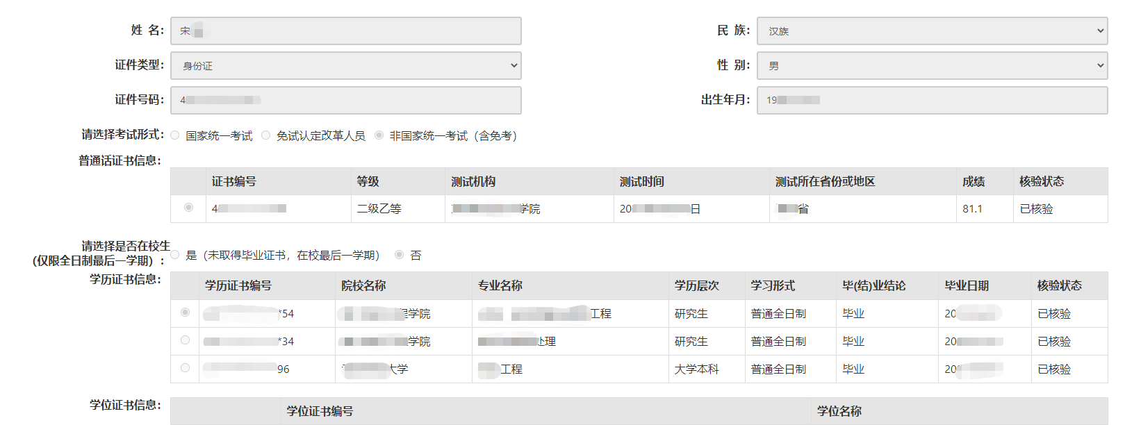 學(xué)歷證書(shū)信息:根據(jù)申請(qǐng)人所取得的學(xué)歷證書(shū)選擇學(xué)歷的校驗(yàn)類(lèi)型。