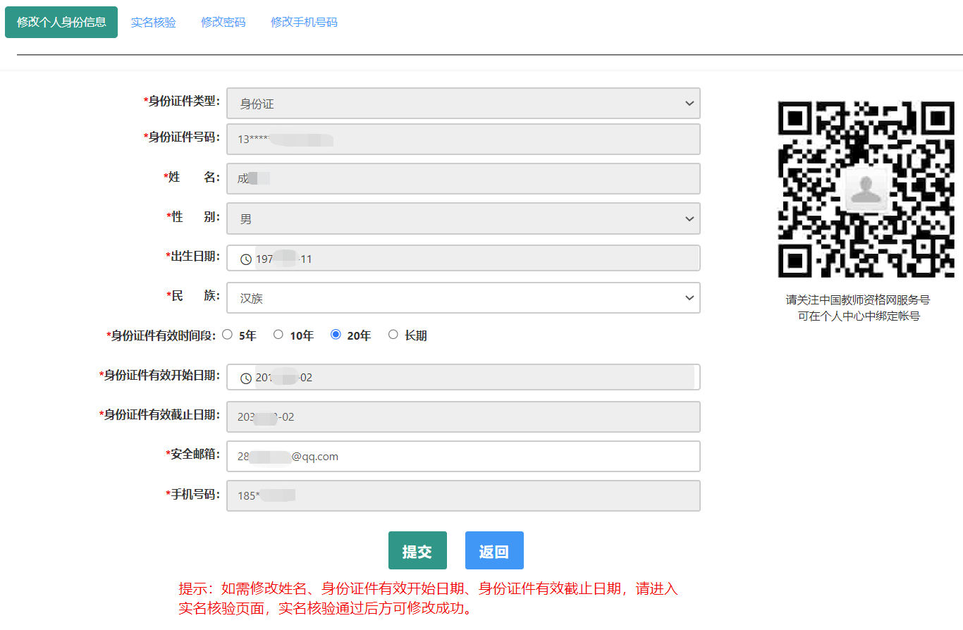 本功能用于修改個(gè)人身份信息、實(shí)名核驗(yàn)、修改密碼、修改手機(jī)號(hào)碼等。