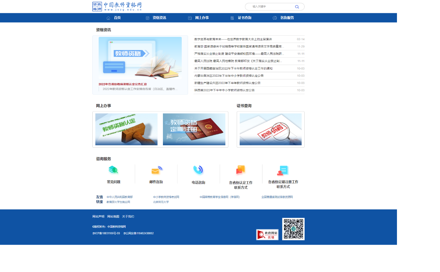 申請(qǐng)人登錄中國(guó)教師資格網(wǎng)(http://www.jszg.edu.cn),將看到中國(guó)教師資格網(wǎng)首頁(yè)如下圖。因各瀏覽器兼容適配問(wèn)題,建議您使用谷歌瀏覽器或360安全瀏覽器極速模式進(jìn)行后續(xù)操作。