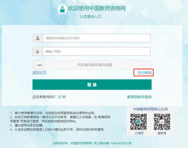 建議您通過(guò)微信掃碼關(guān)注中國(guó)教師資格網(wǎng)服務(wù)號(hào),并與本系統(tǒng)賬號(hào)綁定,以便于忘記密碼時(shí)進(jìn)行密碼重置。