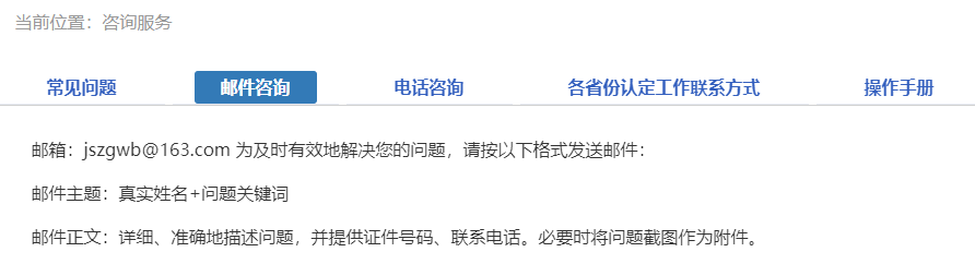 如果仍不能解決問(wèn)題,請(qǐng)按“郵件咨詢(xún)”中的格式發(fā)送郵件或撥打咨詢(xún)電話(huà),聯(lián)系網(wǎng)站工作人員解決問(wèn)題。