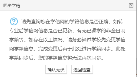 學(xué)籍信息:應(yīng)屆畢業(yè)生只可在認(rèn)定報(bào)名過(guò)程中通過(guò)【同步學(xué)籍】功能進(jìn)行同步。同步后的學(xué)籍信息會(huì)在個(gè)人信息中心展示。研究生應(yīng)屆畢業(yè)生需補(bǔ)錄上個(gè)學(xué)歷信息。