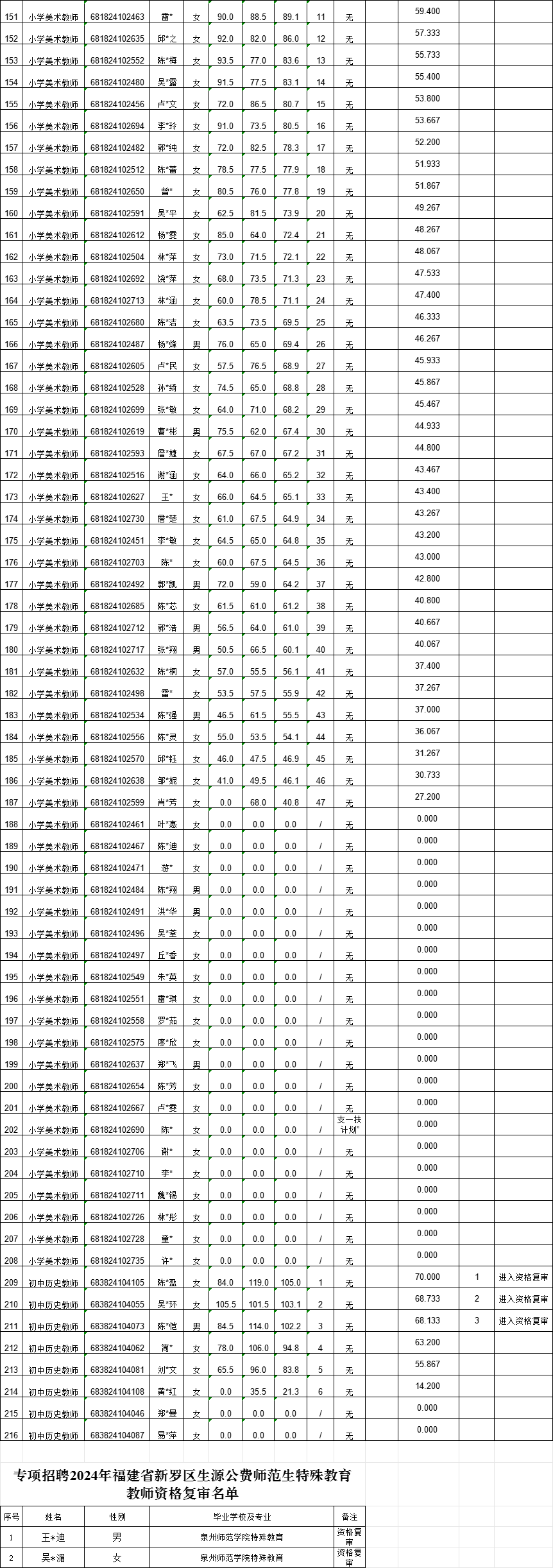 原文標(biāo)題:龍巖市市屬中小學(xué)2024年公開招聘新任教師筆試成績(jī)公布和專項(xiàng)招聘2024年福建省新羅區(qū)生源公費(fèi)師范生特殊教育教師資格復(fù)審名單