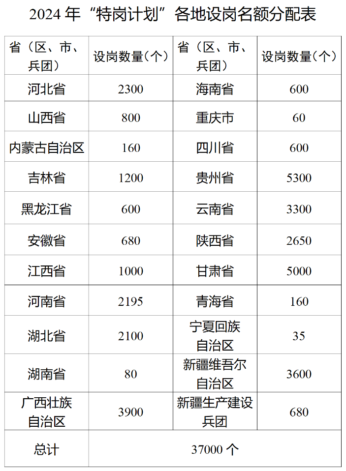 (二)招聘數(shù)量。2024年全國計(jì)劃招聘“特崗計(jì)劃”教師37000名,各省(區(qū)、市)和新疆生產(chǎn)建設(shè)兵團(tuán)的招聘名額見2024年“特崗計(jì)劃”各地設(shè)崗名額分配表(附件)。