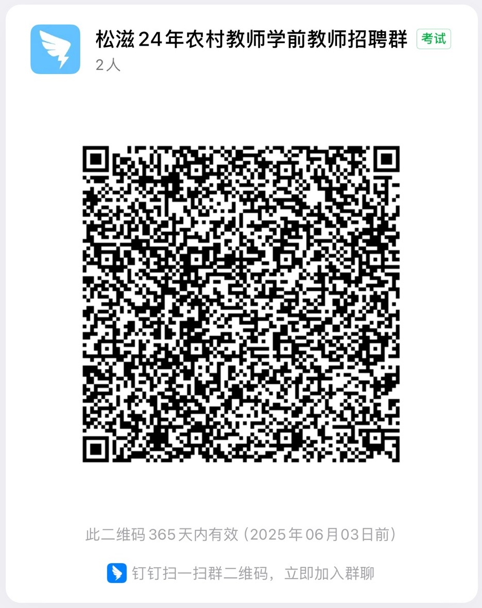 1.安裝釘釘APP,申請或掃碼加入“釘釘群”:松滋24年農(nóng)村、城鎮(zhèn)教師學前教師招聘群,群號:35899208,或掃以下二維碼加入該群。
