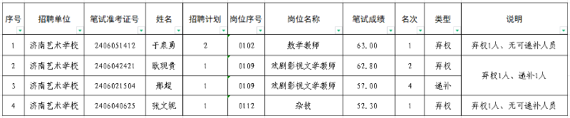 濟(jì)南藝術(shù)學(xué)校2024年公開招聘人員資格復(fù)審工作已結(jié)束。根據(jù)資格復(fù)審情況現(xiàn)就棄權(quán)、遞補(bǔ)情況公示如下: