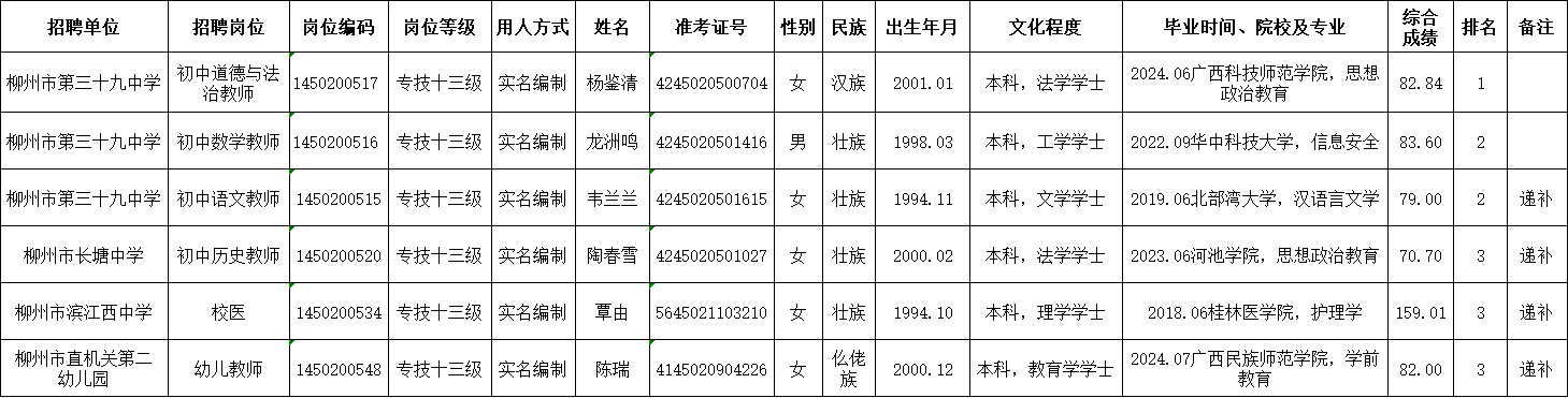 原文標(biāo)題:2024年度柳北區(qū)所屬事業(yè)單位公開(kāi)考試招聘工作人員擬聘用人選公示(第六批)-擬聘用人選公示-廣西柳州市人力資源和社會(huì)保障局網(wǎng)站