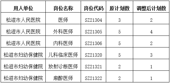 根據(jù)各崗位通過資格初審人員情況并按照《松滋市2021年事業(yè)單位、教育教學(xué)、醫(yī)療衛(wèi)生人才引進(jìn)公告》,現(xiàn)對部分崗位計(jì)劃數(shù)進(jìn)行取消或調(diào)整: