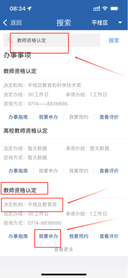 在搜索欄搜索“教師資格認(rèn)定,選擇法定機(jī)構(gòu)為平桂區(qū)教育局的事項(xiàng):“教師資格認(rèn)定,點(diǎn)擊“我要申辦,進(jìn)入辦理頁(yè)面。