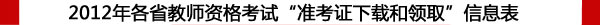 2012年教師資格證考試已拉開(kāi)帷幕。以下是根據(jù)各地考試通知整理出的關(guān)于各省考試準(zhǔn)考證下載或領(lǐng)取時(shí)間以供各位考生參考及時(shí)下載準(zhǔn)考證。
