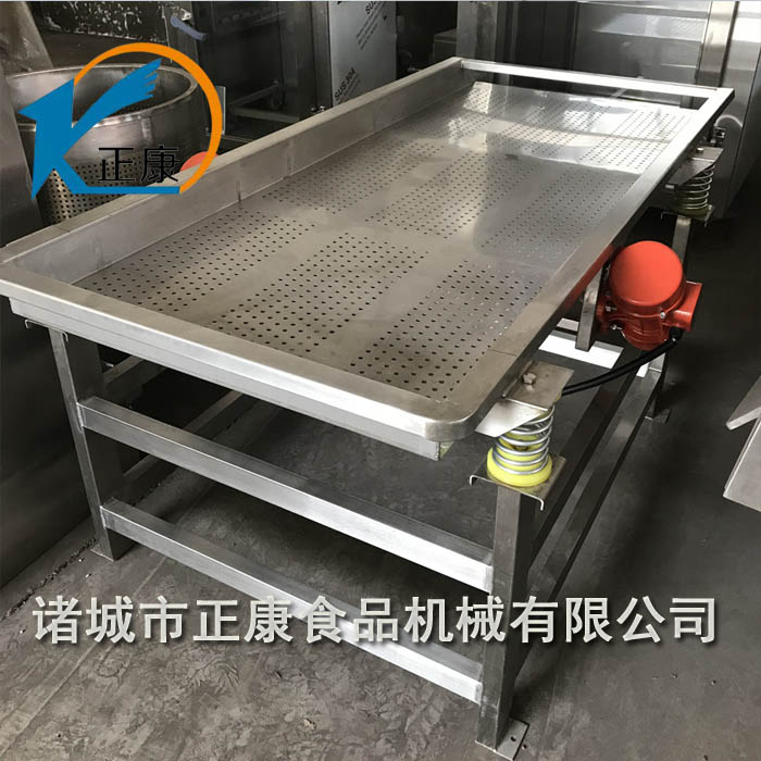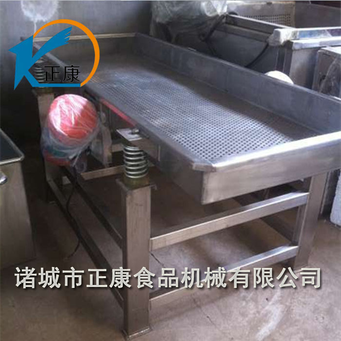 振動瀝水機又叫瀝水振動篩是一種常用的輕型振動瀝水設備,該直線振動瀝水篩是利用兩臺轉向相反的振動電機激振的原理,使物料在篩面上作跳躍式直線運動。本機廣泛應用于糧食、蔬菜、食品等各行各業中,適用于各種物料不同程度的分級和脫水作業。該設備也用于巴氏殺菌冷卻后的食品包裝袋表面除水,及蔬菜清洗后表面水分的去除。經振動瀝水后,大部分水滴已被去除,剩余水份再經風干機吹干后便可裝箱入庫。